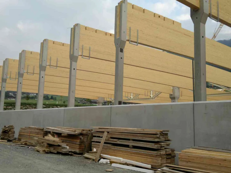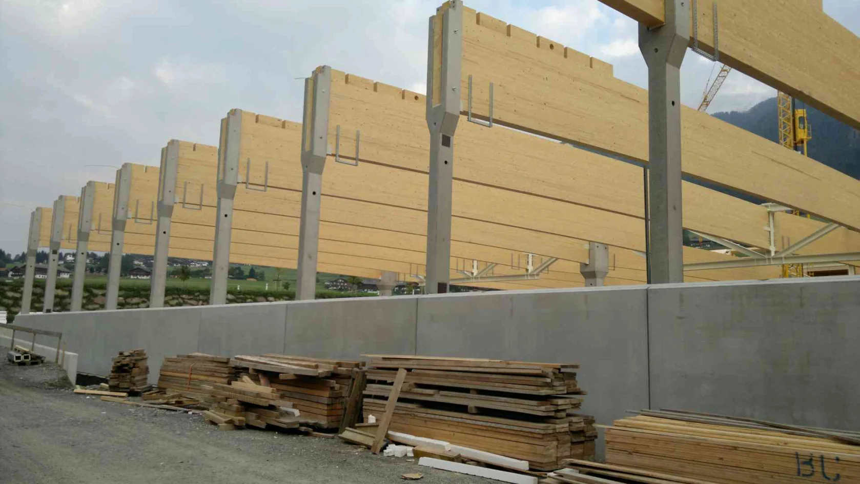 Montage von 200 cm Brettschichtbindern für ein Hallentragwerk für Fussenegger Holzbau. Einige der Träger waren über 36 m lang und wurden per Schwerlasttransport über die Alpen gebracht.