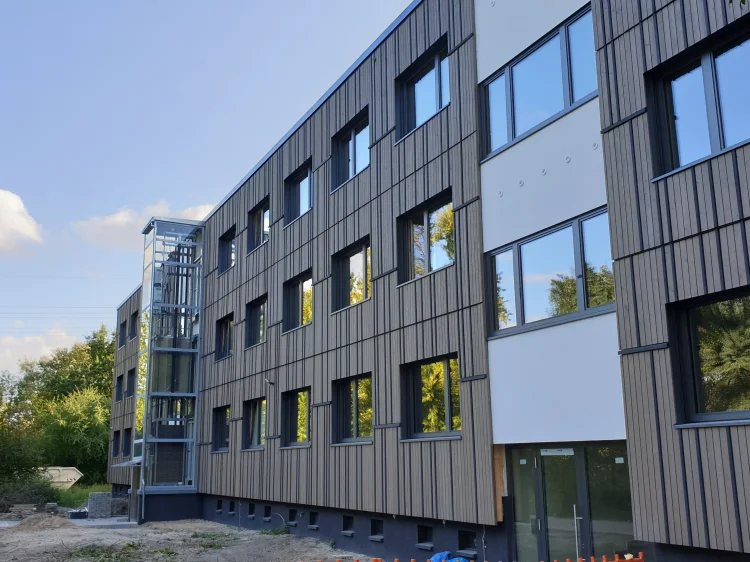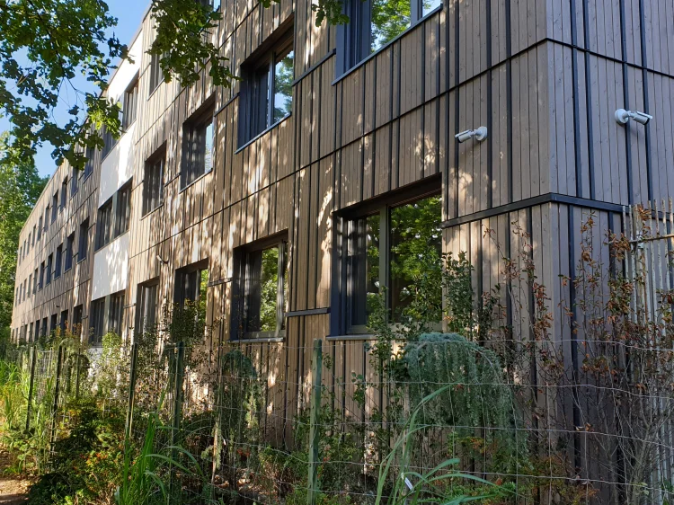 Energetische Sanierung eines Verwaltungsgebäudes des Berliner Tierparks durch vorgehangene Fassadenelemente in Holzrahmenbau mit fertigen Fenstern.