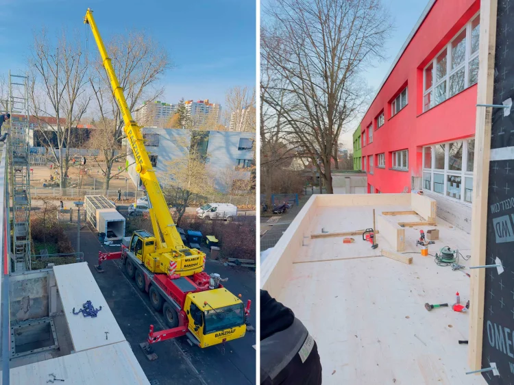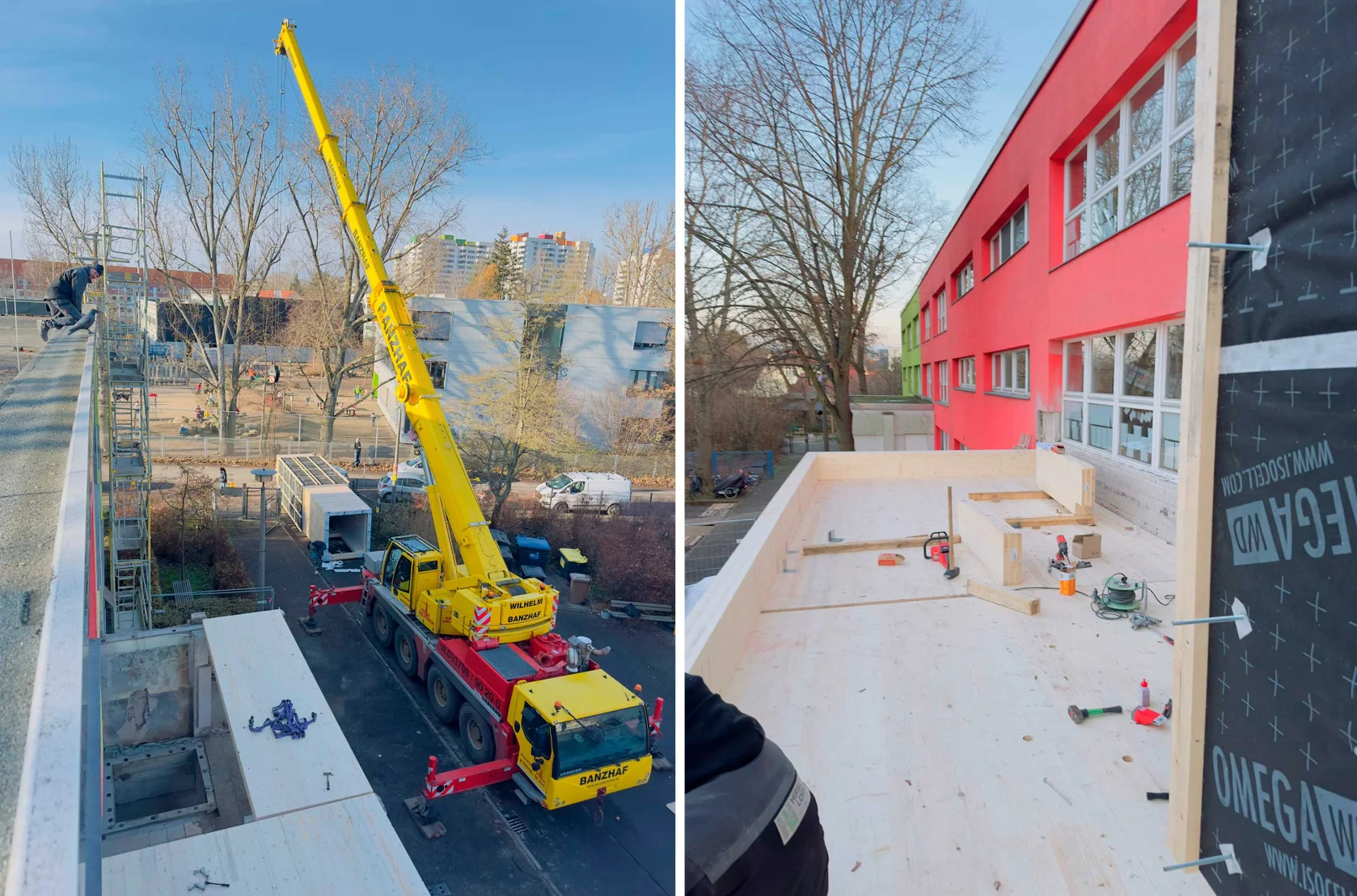 Für die inklusionsgerechte Erschließung erfolgte der Neubau zweier Fahrstuhlschächte in Holzbauweise an die Bestandsbauten der beiden Kitas.