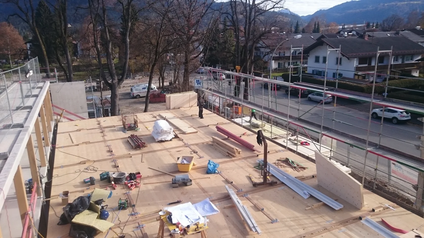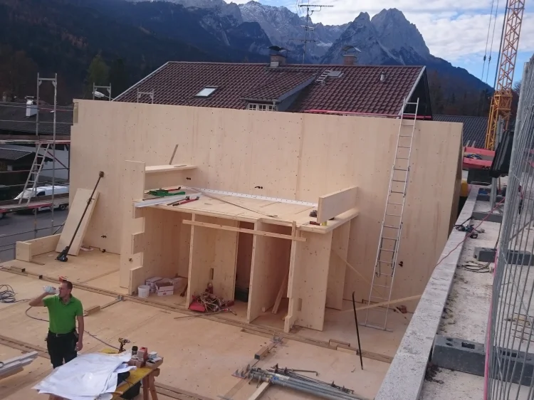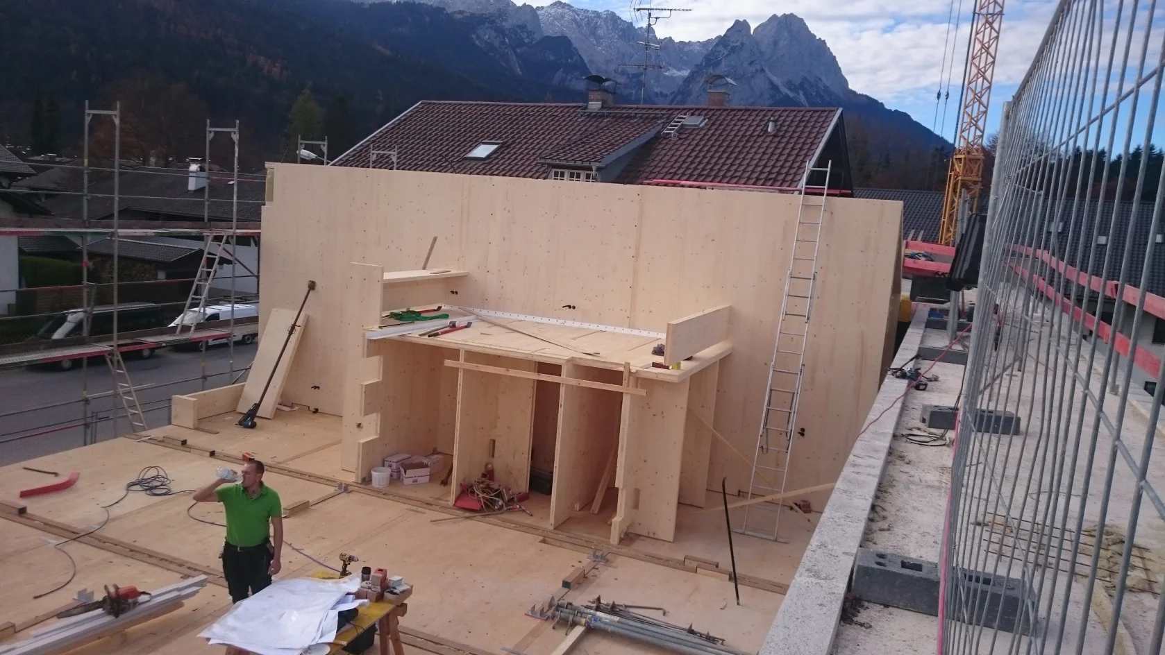 Montage eines zweigeschossigen Hotels in Massivholz im Auftrag der Firma Schmid in Garmisch Partenkirchen.