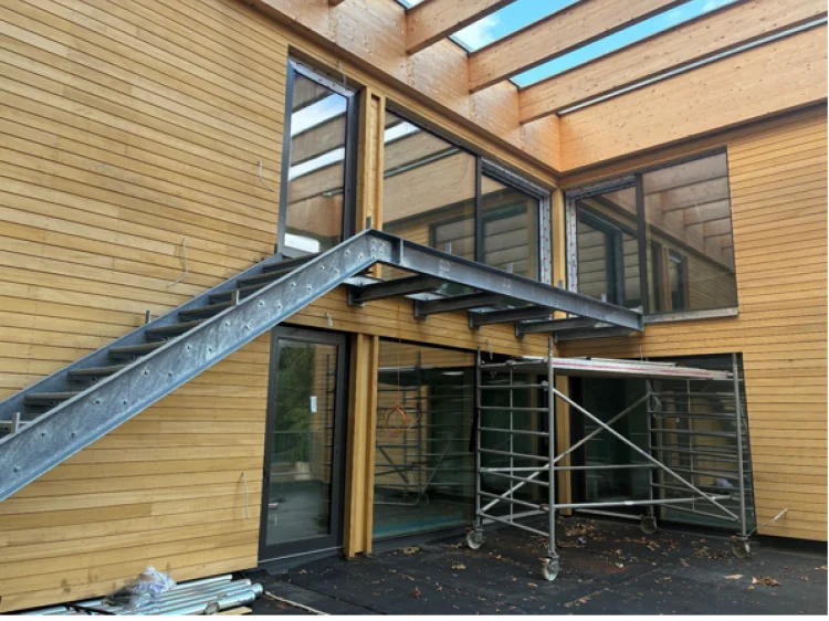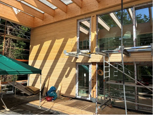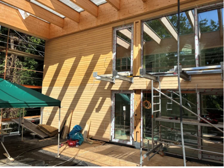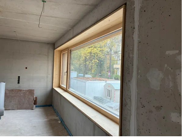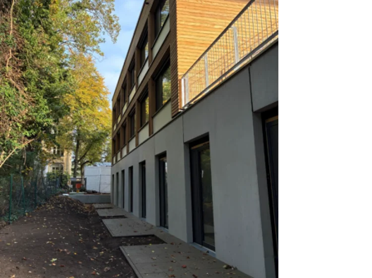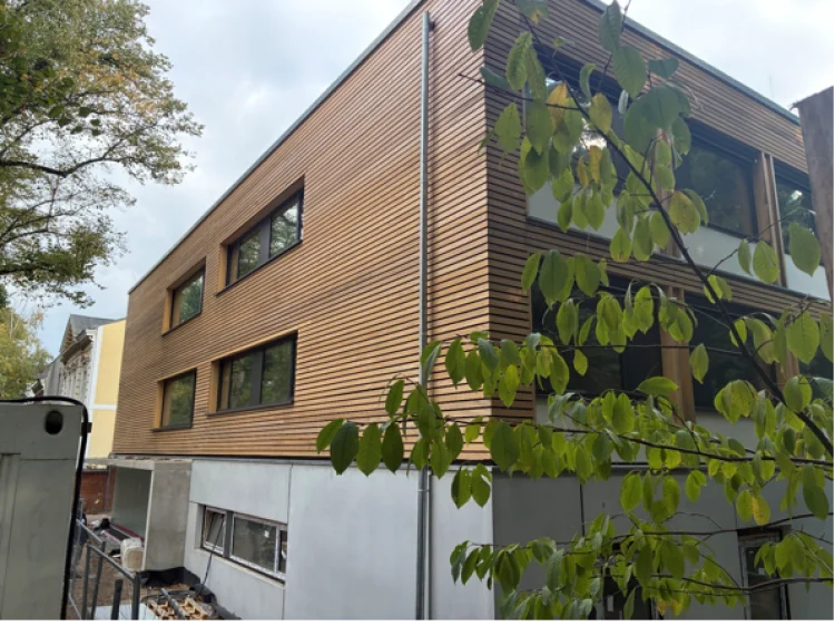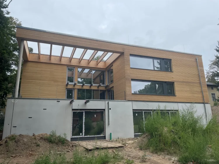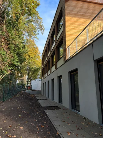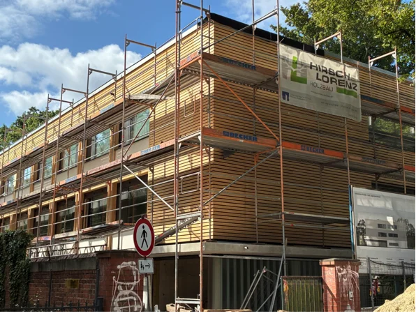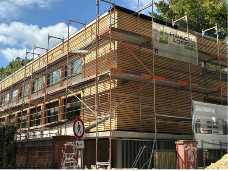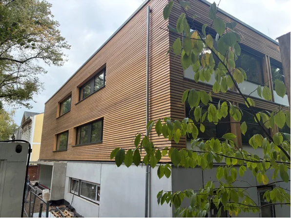 Neubau eines Hauses für inklusives Wohnen, mit 6 Nutzungseinheiten. Das Gebäude ist in Zusammenarbeit mit Hirsch + Lorenz Ingenieurbau in Massivbauweise errichtet worden. Die nichttragende Holzaußenwandkonstruktion ist innen und außen holzsichtig – als vorgehangene Fassade.