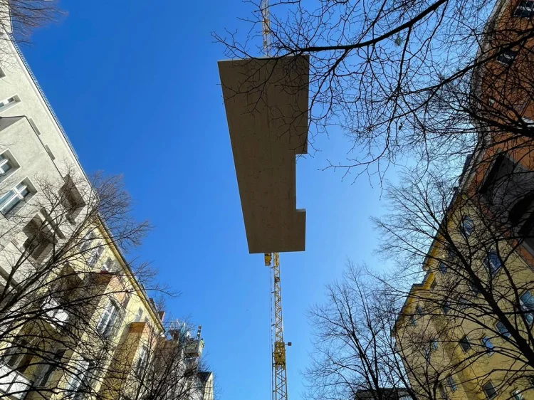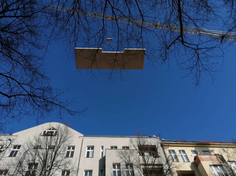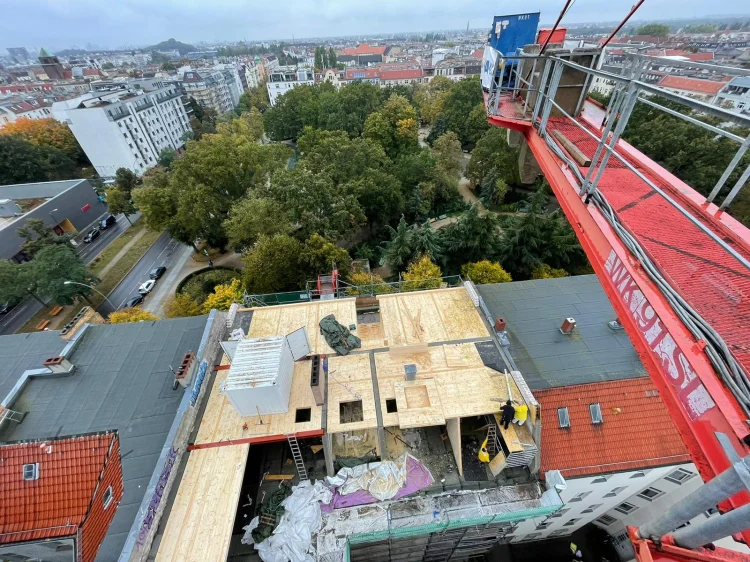 Erweiterter Holzrohbau in Massivbau für Dachaufstockung auf Vorderhaus, Hinterhaus und Quergebäude eines Wohnhauses in Prenzlauer Berg. Dadurch sind drei Wohnungen mit über 400 qm und großen Terrassen entstanden.