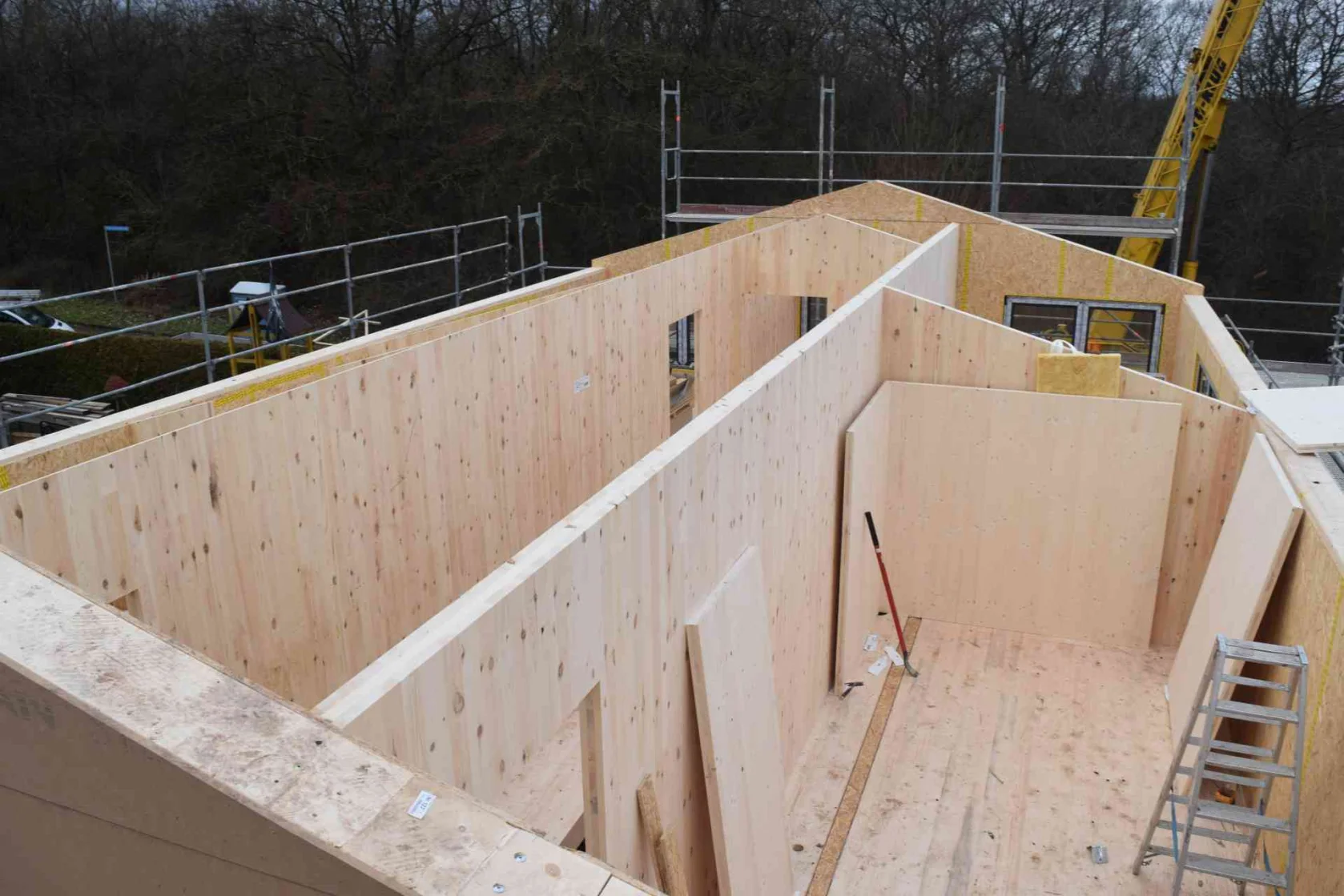 Erweiterter Rohbau inklusive Dach und Fassade. Der gesamte Baukörper wurde in Massivholz mit Fassaden in Holzrahmenbau ausgeführt.